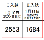 | 1/10 I入試 (東大・難関大) | 1/11 II入試 (難関大) | 1/12 東大特待 4科+算 | 1/16 III入試 (東大・難関大) | 1/18 (旧東大II) | 計 | |